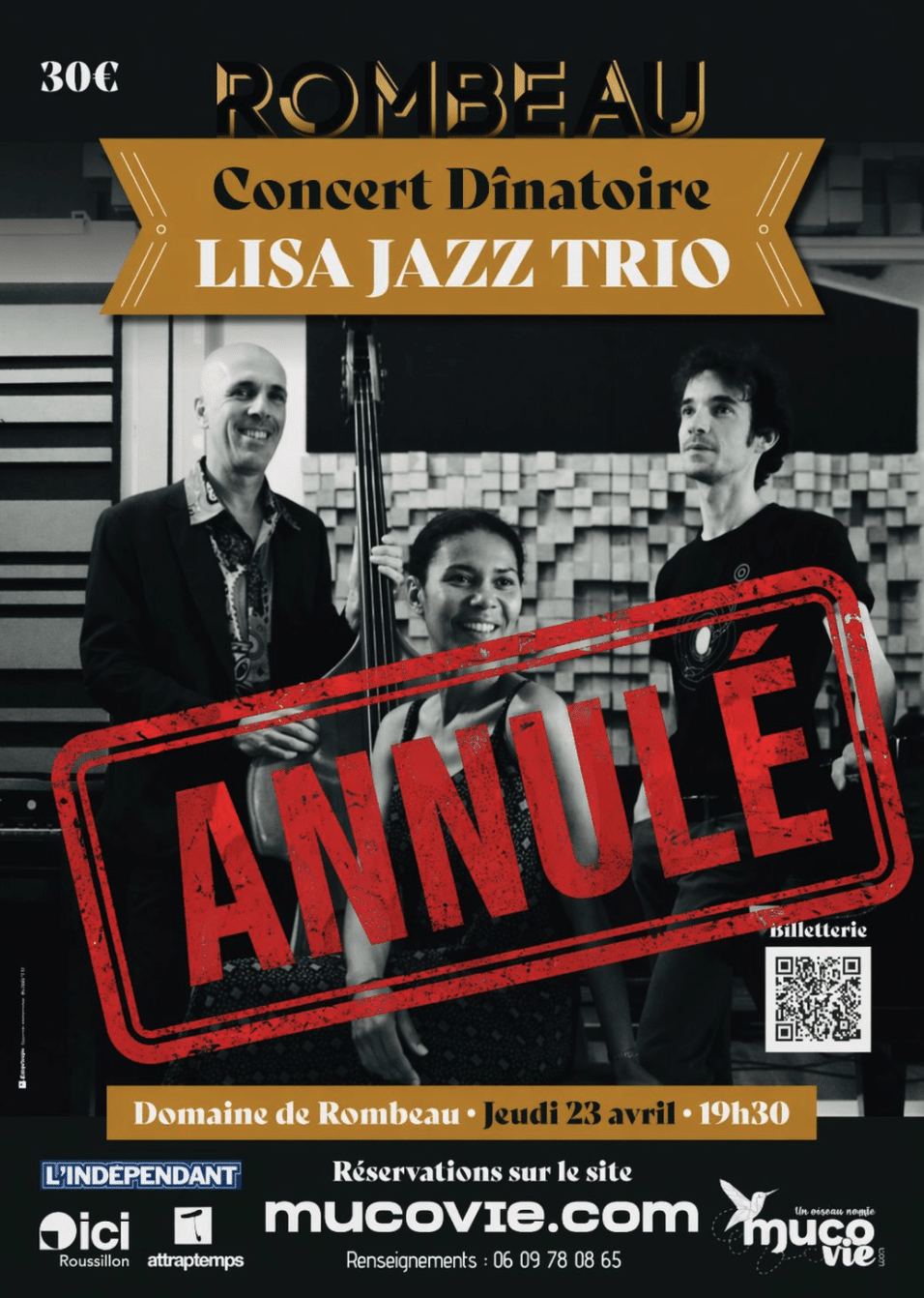 LISA JAZZ TRIO en concert et repas au Domaine de Rombeau Date : Jeudi 23 avril à 19h30 Prix : 30 € Acheter mon billet En partenariat avec L'Indépendant, Ici Roussillon et AttrapTemps